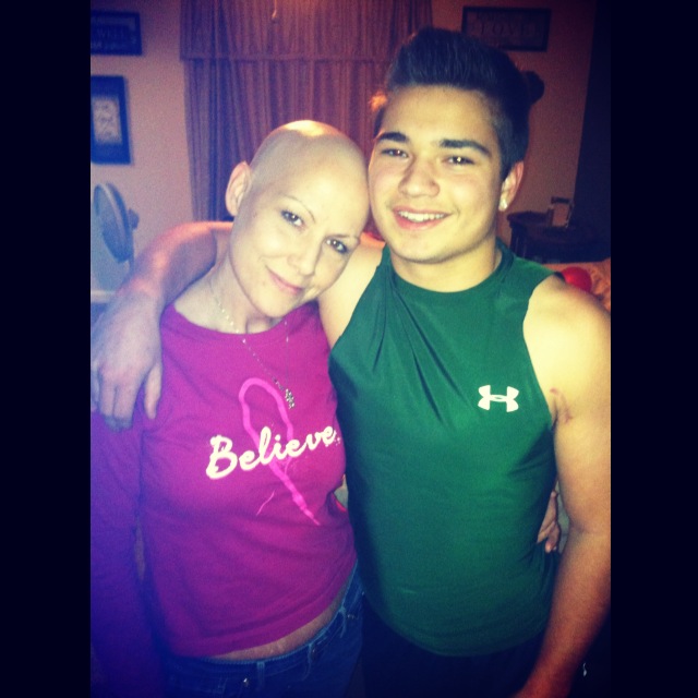So, I wrote about my raw tongue yesterday…. it’s like when you have a swollen tastebud but it’s all over your tongue…. yes, it’s lovely. So… I’m at the point where I get the puffy, watery eyes…. My son took a photo last night with me and I’m so glad he did… because it literally… comes on overnight. I look like a chemo patient…. Well, this morning, I woke up with a super swollen Uvula…. It’s been super dry at night, I wake up every morning all dry…. and parched, so I have my water by the bed…. I went to look in the mirror and I’m like… holy smokes! I showed Darrell… he’s like yep, it’s really swollen….. So I have a call into my doctor. I wrote about it on my message boards… they said it indicates a reaction to something. Well it’s 13 days past chemo…. I just find that so odd!? I guess apparently it’s normal for the reactions to keep coming because I’m on this cycle and it’s literally like clockwork…. Waiting on a call from my doctor…. This is the picture of me and my son Preston… ❤